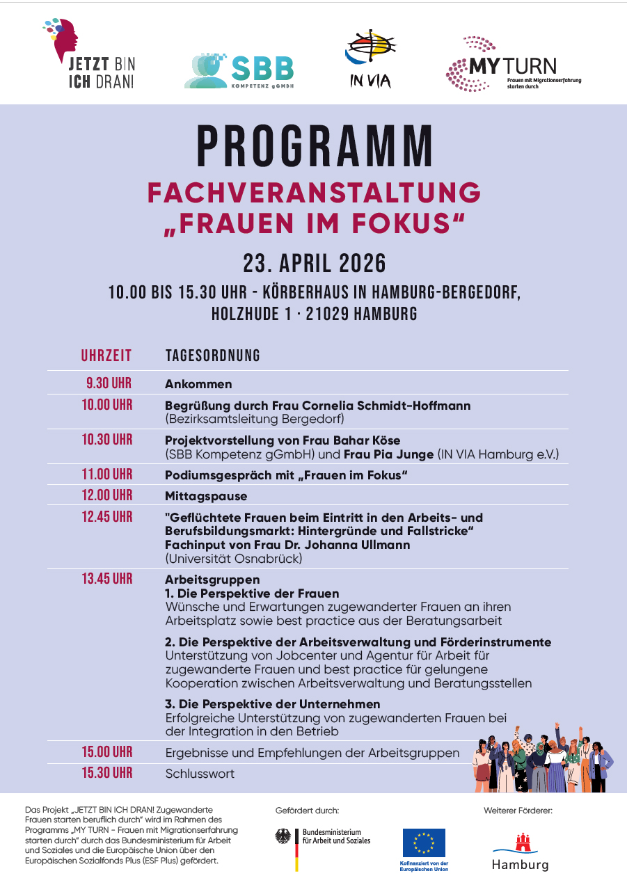 Am 23. April 2026 findet von 10.00 bis 15.30 Uhr die Fachveranstaltung „Frauen im Fokus“ der SBB Kompetenz gGmbH im Körberhaus, Holzhude 1, statt. Die Teilnahme ist kostenlos und für Verpflegung ist gesorgt.